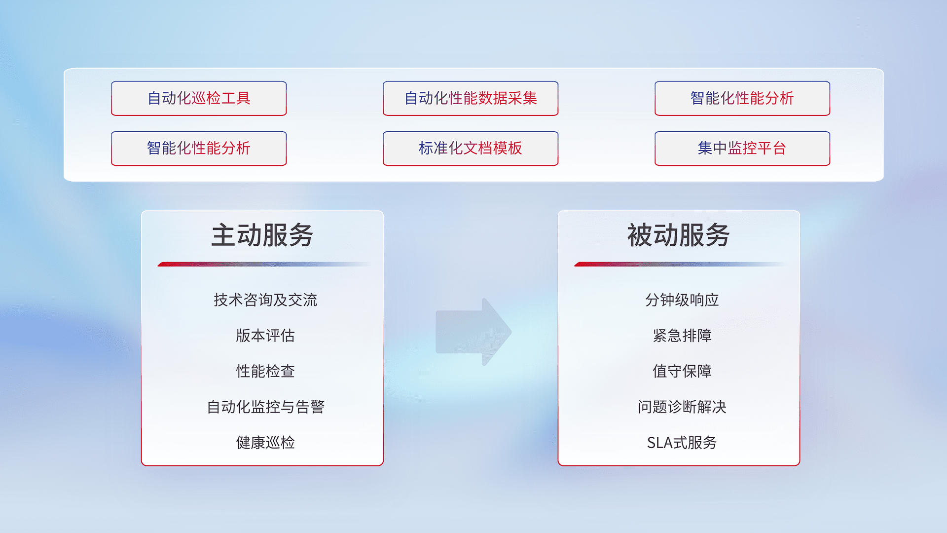 智能化工具和标准化文档,,,保障服务质量,,提供主动服务(包含技术咨询、、版本评估、、性能检查、、、自动化监控与告警、、、、健康巡检)和被动服务包含(分钟级响应、、、紧急排障、、值守保障、、、问题诊断解决、、、、SLA服务)。。